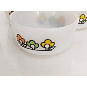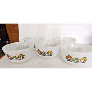 This vintage set from the 1970's features a glossy white milk glass finish with a floral pattern, perfect for serving desserts or baking individual custards. Each round dish measures 1 3/4" in height and is chip-resistant, adding a touch of springtime charm to your table setting. Made in the United States by Anchor Hocking Fire King, this set is a lovely addition to any collection of decorative cookware and dinnerware.