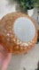 This bowl is made of milk glass with a peach luster finish and features a distinctive raised bubble pattern and scalloped edge.