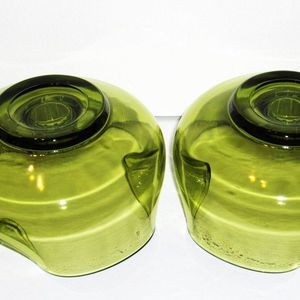 This is a pair (2) of vintage, candle stick holders. They were made by the Anchor Hocking Glass Company of avocado green colored glass. They have a wonderful tri fold design and match very nicely. They measure 2 1/2" tall and about 5" wide. The part that actually holds the candle tapers from 7/8" to 3/4" and has verticle protrusions to hold it securely. This is a gorgeous set that is in excellent condition. A few of the usual manufacturing glitches, but no scratches, chips, or any other signs of wear or use.