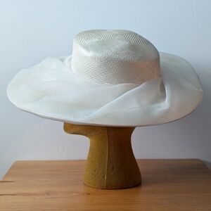 Lovely Andre Canadian Hat, purchased in 1990s, never worn. White straw and tulle. Comes with hat box. There seems to be a small imperfection in the weave (see photo close up).