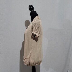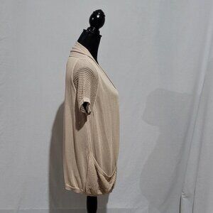 Andrea Jovine beige cardigan. Knit cocoon sweater with crochet short sleeves and pockets. Open style, there are not any buttons or zippers. There are pouch pockets at the waist. It is marked a size medium. 89% viscose and 11% nylon. New with tag.