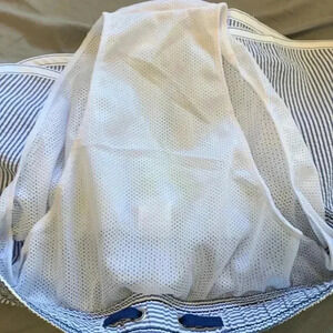 White suit with blue stripes. There is a tie at the waist and two front pockets. They have a mesh lining and the waistband has lots of stretch.