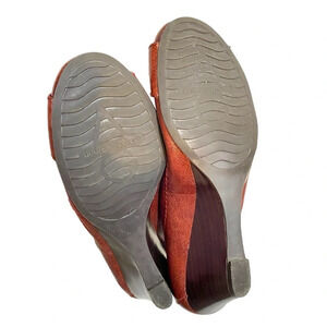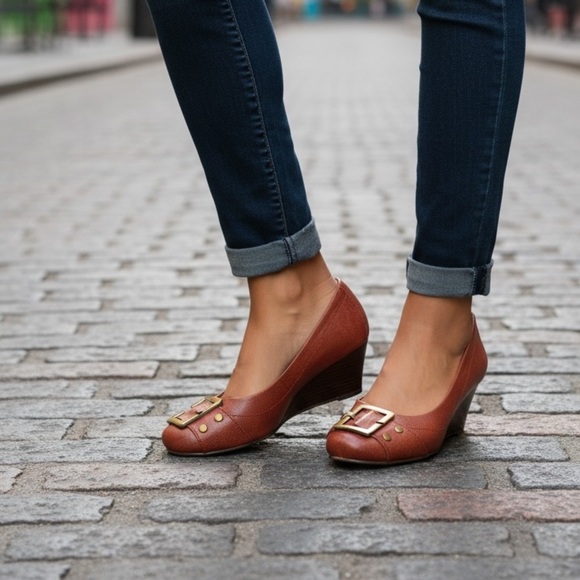 Andrew Geller NWOT Size 7 Reddish Brown with antiqued Gold Buckle WEDGE Heel 2.5inches high