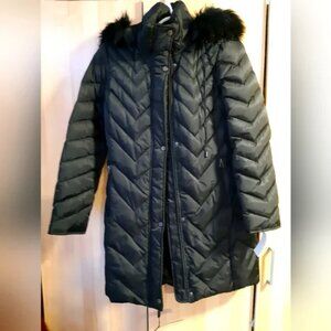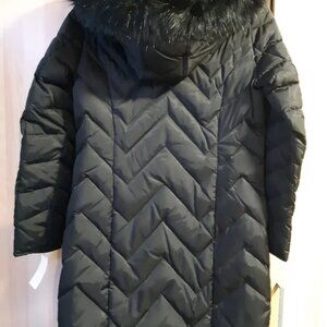 Beautiful, new quilted coat with down and feathers built for Canadian winters. The Chevron quilting gives this midweight, hooded down-and-feather coat extra style points,