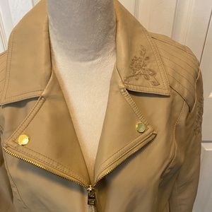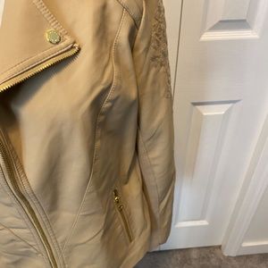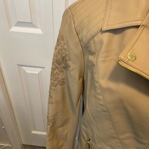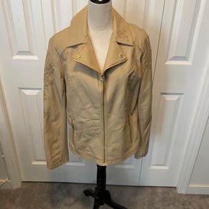 Faux leather in a nutral tan color great for any season embroidery on sleeves