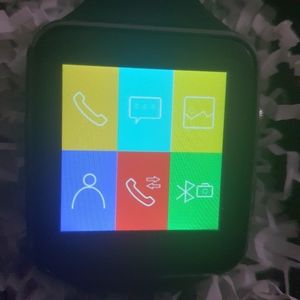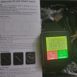 Android compatible smart watch with SIM & SD card ports. Comes in box with manual and charge cable. Works great with BT connectivity. Can make calls via SIM or BT. Has built-in camera plus connects to phone camera. Can be used alone or paired with phone through app.