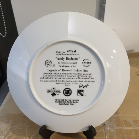The Andy Bathgate Vintage Legends of Hockey's Golden Era Bradford Exchange Plate is a collector's item celebrating the legendary hockey player from the late 20th century. Made by Bradford Exchange in partnership with Dominion China, this vintage collector's plate highlights Bathgate's career and contributions to the sport during the golden era of hockey. Perfect for collectors of sports memorabilia or fans of classic hockey players, this limited edition plate from the 1990s is a special piece of sports history that would make a unique and cherished addition to any collection.