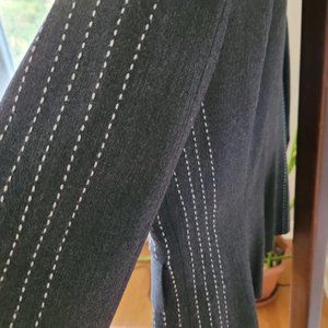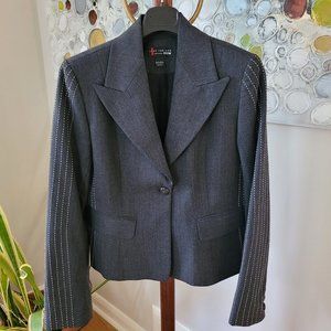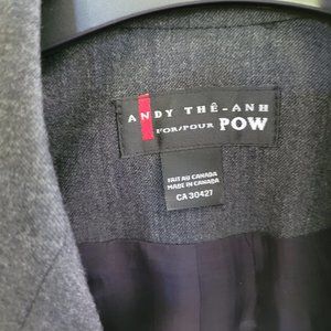This gorgeous high-quality jacket from designer Andy The-Anh (for POW) is a virgin wool/poly/elastane blend. It has unique white stitched detail and is in excellent condition with some small pulls in the stitching and one small pick (from wearing a poppy) on the lapel (see pictures - they are honestly hardly noticeable when wearing the jacket). It has a single button front closure and front pockets. It is sized US 8 but fits a bit bigger (8-10) - see measurements. From a smoke free and pet free home.