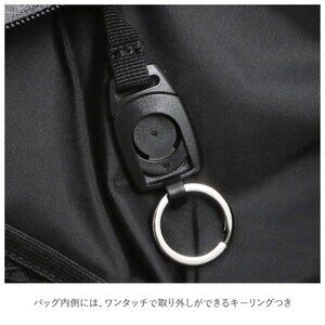 Comes with a keyleash. There is a little staining, but can be easily cleaned. Strap can be buckled to the left or right side of the bag.