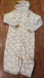 All over embossed cloud print all in one, complete with hood. A onesie that will make getting out of bed on those dark, cold mornings a bit more bearable. You won't have to worry about getting the chills this winter! Gold halo wings and trim.