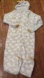 All over embossed cloud print all in one, complete with hood. A onesie that will make getting out of bed on those dark, cold mornings a bit more bearable. You won't have to worry about getting the chills this winter! Gold halo wings and trim.