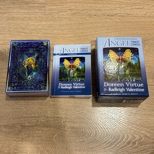 A complete set of 78 Angel Taro Cards by Doreen Virtue and Raleigh Valentine. It contains a guidebook and beautifully illustrated cards. In good used condition.
