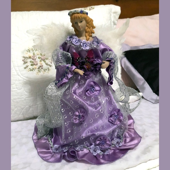 Unique, hand sewn angel. Porcelain head and hands. Tree topper, or have it on the side table or on the fireplace mantel. Pls check fine details on a dress. Beautifully done. 13” tall. 10” wings. Comes in beatiful heavy gift box that is good for storage as well. (Photo of the box will be added later)