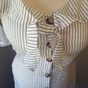 Angeleye London Cassie cold shoulder button down dress. Sz US 10. Brown buttons. Tie belt. Ruffle around the bodice and as a sleeve. Knot in front bodice. Spare button. 80% viscose, 20% polyamide. Approximate flat lay measurements: waist 16", pit to pit 19", shoulder to hem 43". Smoke free home.