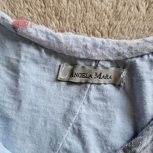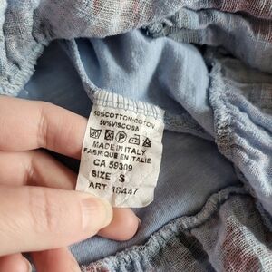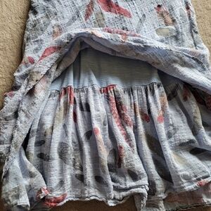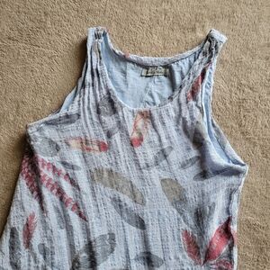 Light blue summer dress, cotton viscose blend crinkle fabric with leaf pattern. Lined with matching trim at the bottom of the lining. In good used condition