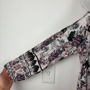 Elegant long sleeve tunic top by Angie. Features a floral pattern and a cold shoulder, as well as an attractive open back. Very soft and comfortable fabric.