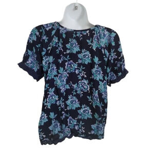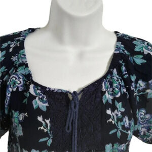 Loose and flowy dark blue floral peasant style blouse with Boho vibe. Crocheting along all hems and a decorative patch on the chest. Tie-up cord with tassles and beads. Elastic hem at shoulder at the neckline. A bit of give in the fabric.