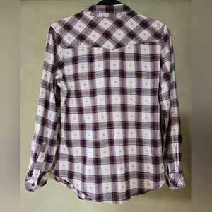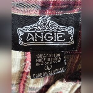 Chic Angie plaid shirt in red and cream. Features a stylish button-up design.
