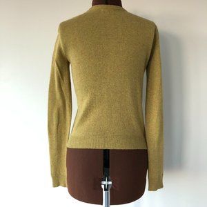Yellow angora blend cardigan with rose gold metallic embroidery on bodice, front button front closure and long sleeves, ribbed cuffs and hem band. The front button edging has a wave to it which is the result of the buttonholes on the material and being stored button up. It does not affect wear.
