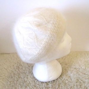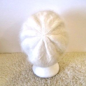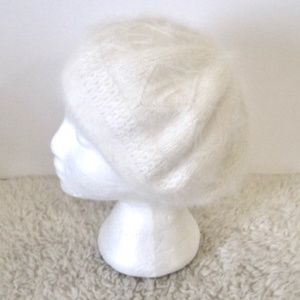 Angora blend knitted beret. Color: Ivory: Beautifully soft and fluffy beret crafted in a cozy angora blend. One size fits all with a stretchy brim. Made in Italy.