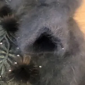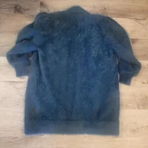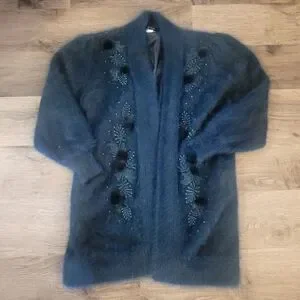 Women's Lady Monica angora, wool, nylon blend long cardigan. Ink blue colour. Embroidered details with beads and pom poms. No size tag, but I'd say large. 23" pit to pit. No buttons or snaps. Fully lined. No rips or stains.