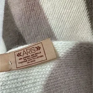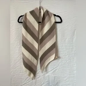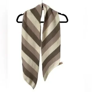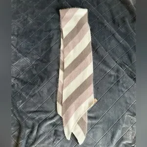 The softest scarf! Made in the Philippines, it’s a mix of angora, wool, and polyamide. Measures 7” wide, 32” long to the longest point (measurement taken while lying flat, folded in half). The bottoms come to a point adding even more interest! The lighting makes the colour seem more purple but they’re all shades of brown.