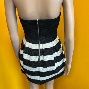 Black & White Striped Strapless Dress. Back Zip Enclosure. Pleated Skirt.