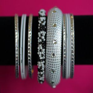 10 piece Bangle set in black, white and silver. Slide on (no clasp)