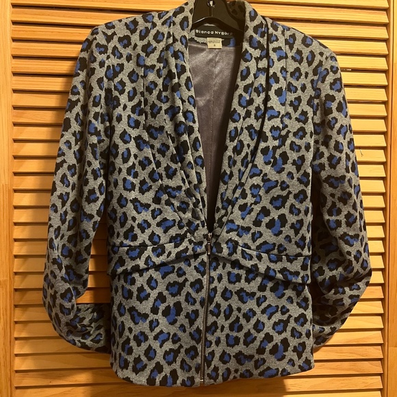 Grey with blue and black animal print blazer. Fully lined, peplum detailed waistband, 1/2 zipper closure. Can be worn open or closed. Outer shell 70% polyester, 28% cotton, 2% spandex.