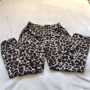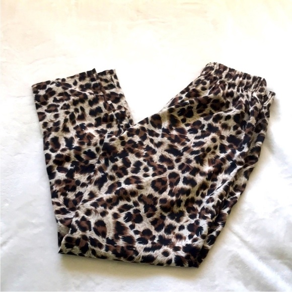 Stylish animal print pants. Features a mix of black, brown, and cream colors.