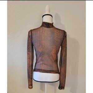 Brown stretchy all over animal print top features sheer see through, long sleeves, turtleneck