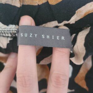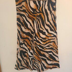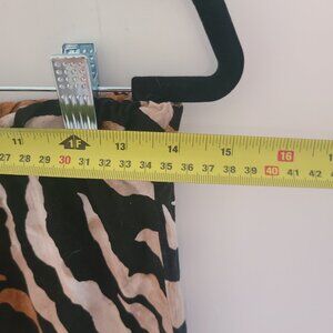 Tiger (?) print skirt from Suzy Shier. Elastic waist. 100% rayon. No listed size, see pictures for measurements.