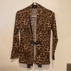 Brown Animal Print open front cardigan with black buckle snap belt closure. Brand is Tiana B. Size Small. Used and in excellent condition. Great Fall piece!