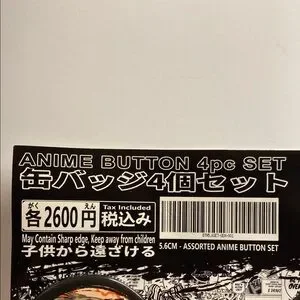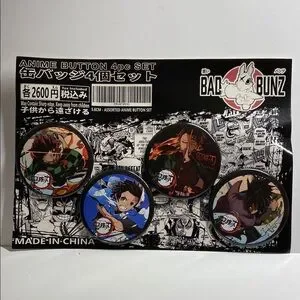 Set of four anime buttons featuring vibrant designs. Perfect for fans and collectors.