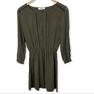 Anine Bing Khaki Green Mini Dress in Women's Size Small. Crepe olive green with crocheted embellishments on the bodice and shoulders. 3/4 sleeves, button cuffs and elastic waist. Viscose. Very good pre-loved condition. No visible flaws.