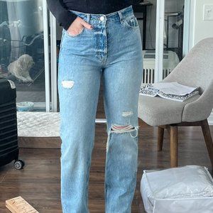 Wide leg blue jeans with rips, worn once. Beautifully made, cotton, no-stretch denim.