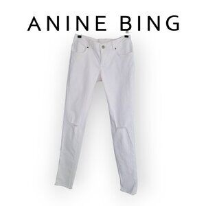 Anine Bing white distressed jeans offer a slim low-rise fit with unique characteristics. Perfect for enhancing casual, chic wardrobes with designer flair.