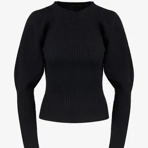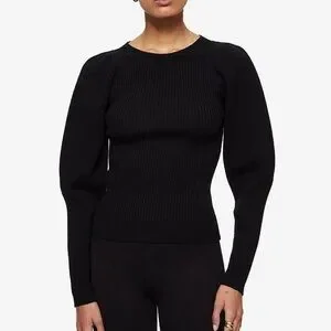 Stylish black ribbed sweater with puff sleeves. Perfect for any occasion.