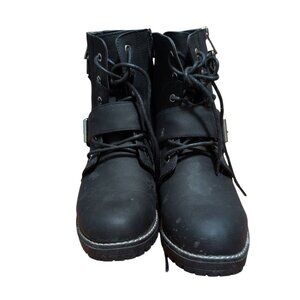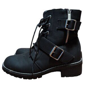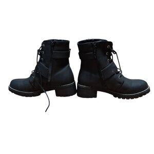 Ankle Boots Black Leather Faux Lace up & Buckle Biker 2" Block Heel Combat Shoes