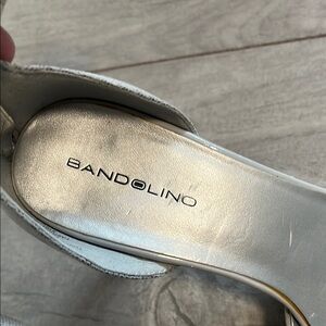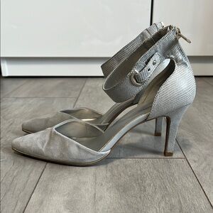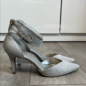 BANDOLINO Step out in style with these elegant gray heels with ankle strap and gold features. Zipper back closure in gold. Perfect for any occasion, these shoes offer both comfort and sophistication with a 3.25” heel.