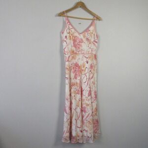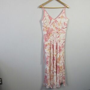 Keywords: Ann Taylor dress, silk dress, floral dress, sleeveless dress, pink dress, peach dress, summer dress, party dress, size 4, women's dress, midi dress, casual dress, floral print, silk blend