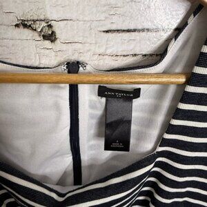 This Ann Taylor dress features a striking black and white stripe pattern, ideal for both casual and cocktail settings. The sleeveless design with a scoop neckline and sheath silhouette offers a sleek and modern look. Made from a stretchy fabric, this mini dress ensures a comfortable fit while maintaining its stylish appeal.