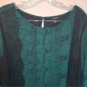 This Ann Taylor blouse showcases a chic color-blocked design with a green center panel and black side panels, creating a slimming effect. The long sleeves and rounded neckline add to its elegant and professional style, perfect for a sophisticated look.