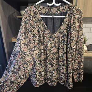 Ann Taylor sleeveless cream blouse with a black clover/shamrock pattern. Lightweight, flowy fabric, size large.
