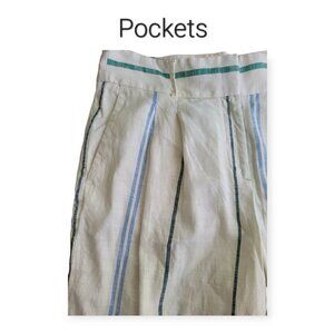 Ann Taylor cream, blue, and green striped wide-leg pants crafted from a breathable linen blend for a comfortable fit. Excellent used condition with slight pilling on inner thighs/crotch.