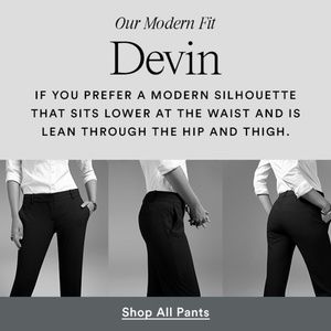 Devin fit is a more modern fit that sits lower on the waist and is lean through hip and thigh.