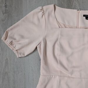 This chic light pink mini dress by Ann Taylor Factory features a flattering sheath silhouette with short puff sleeves and a stylish square neckline. Perfect for wedding guests or cocktail events, its minimalist design and delicate color make it a versatile addition to any wardrobe.