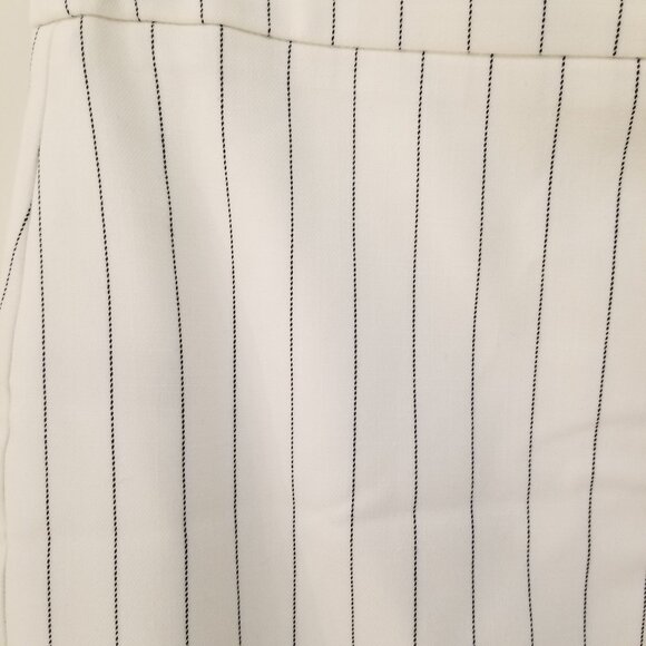 Ann Taylor Factory Pencil Skirt, white with black pinstripe. NWOT. Front slit, zip closure in the back. 15 inches/38 cm across the waist, 25 inches/63.5 cm long. Material is a poly/rayon/spandex mix. Skirt is lined, no pockets. Open to offers.