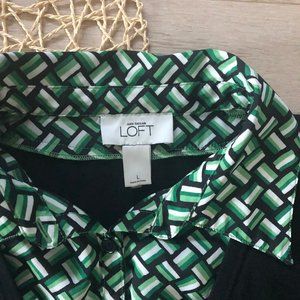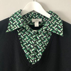 LOFT sweater, the layered look- green button down collar with shirt tail underneath a black sweater. All one piece. Size large (12-14), bust 39"-40.5", waist 32"-33.5", hip 42"-43.5", in great pre-owned condition, light pilling from normal wear. **Any questions, please ask ... I be happy to help**