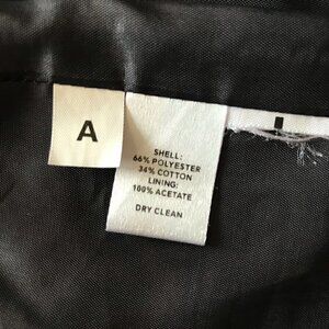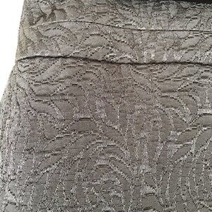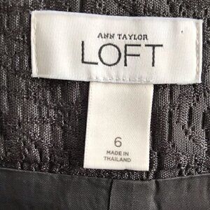 Ann Taylor LOFT black mini skirt. Material has embossed stitching details. Two side slash pockets and concealed zipper at side seam. Kick pleat in back. Shiny with some metallic thread which makes it sparkle under lights. Perfect for an office party or an evening out.